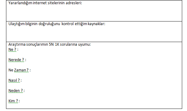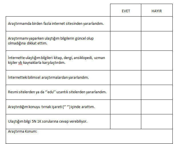 Araştırmanı öğrendiklerine uygun bir şekilde yaptıktan sonra lütfen aşağıdaki tabloyu doldur :)